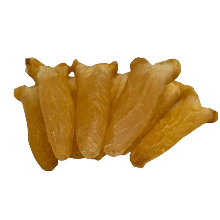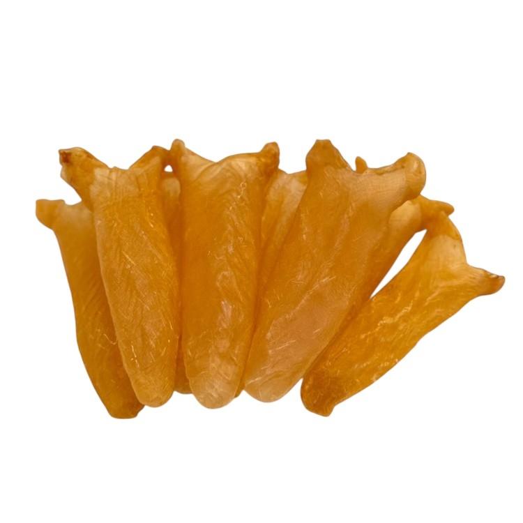 外觀:優質花膠外形大且厚,波紋清晰,顏色淡黃或白色,半透明且有光澤,無血筋和黏質物。